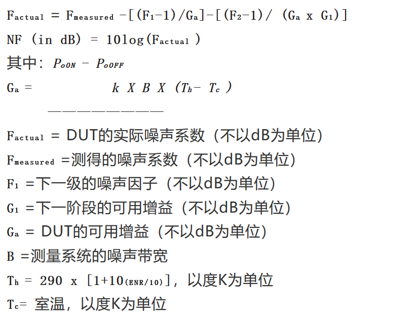 Pon和Poff是DUT的输出瓦特数,而噪声源分别被偏置为开和关。对于不同于290 K的环境温度,应在上述方程式的右侧添加一个校正因子(10logA),其中“ A”定义为:
